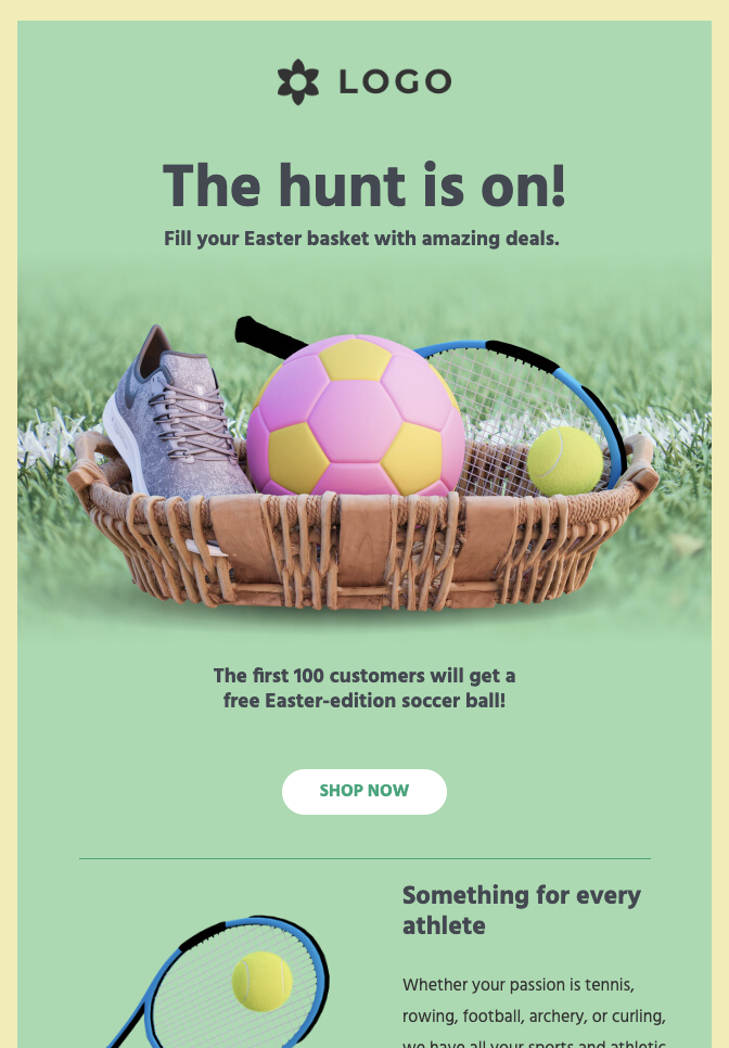 Håll det levande och på temat: Även enkla nyhetsbrev drar nytta av säsongens färger, lekfulla bilder och påskmotiv. Oavsett om du kodar i HTML eller använder en dra-och-släpp-redigerare, sträva efter nyhetsbrev som är iögonfallande och framkallar helgstämning.