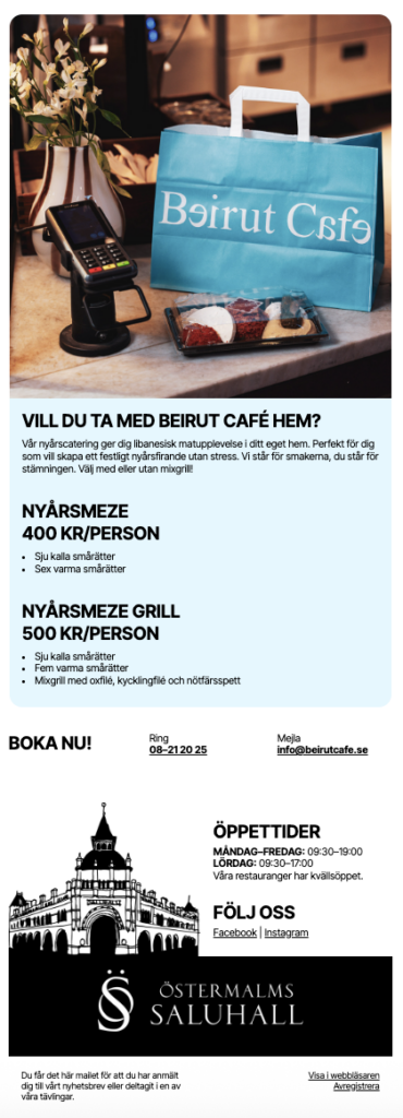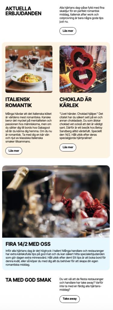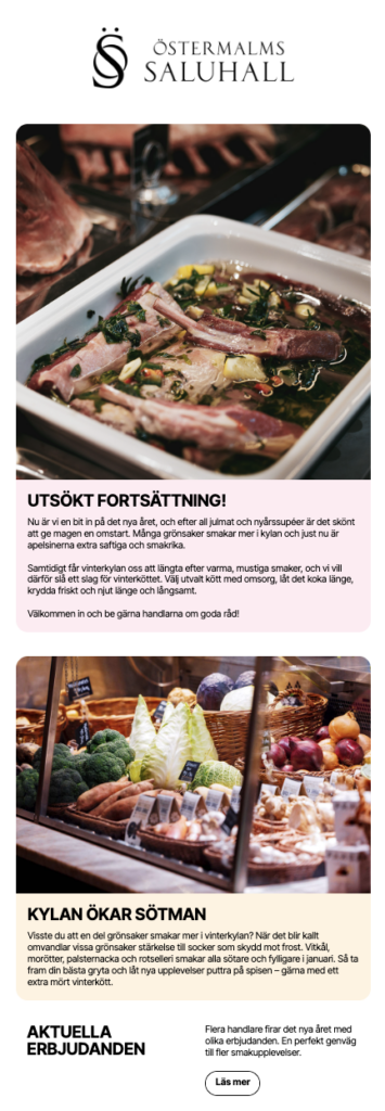 Kommunikationen idag bygger på inspiration, handlarnas erbjudanden, säsongsinnehåll och upplevelser & erbjudanden kopplade till Saluhallen. Ett tydligt värde i varje utskick.