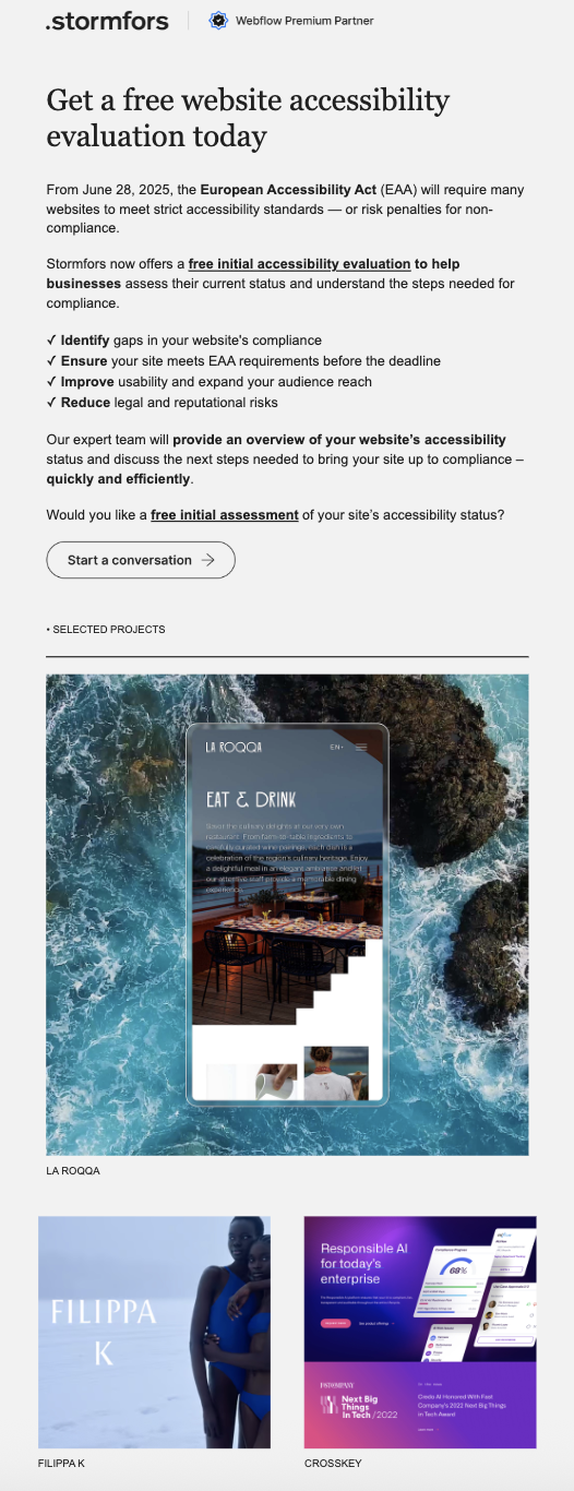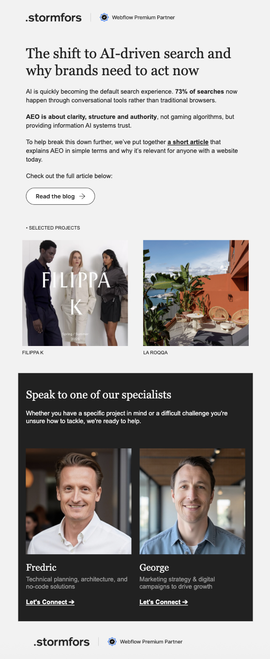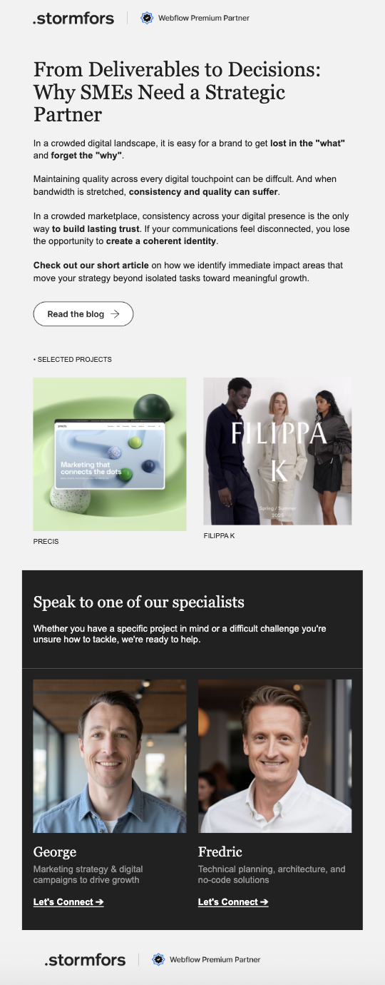 Istället för att skapa nyhetsbrev med mycket design har Stormfors valt att fokusera på det skriftliga innehållet. Deras strategi följer en kommunikationsstil där texten står i centrum, inspirerad av den tydlighet och enkelhet som ofta kännetecknar AI-drivna gränssnitt. De flesta utskick består till stor del av text, med en medvetet diskret design som speglar företagets varumärke. Innehållet utformas utifrån några nyckelfrågor: vad är verkligen intressant för mottagaren, vad vill företaget lyfta fram just nu, och hur kan budskapet göras så lättläst och lättförståeligt som möjligt.