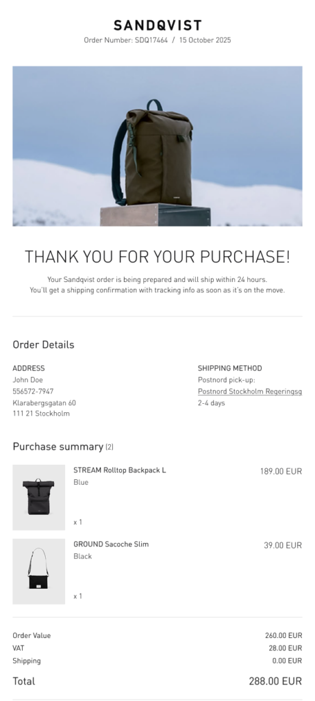 Genom smart användning av medlemsfält, språk-switchar och dynamiska URL:er i Rule, skapades flöden som fungerar automatiskt för varje marknad och språk (44 marknader och 4 språk). Orderbekräftelser, välkomstserier och post-purchase-flöden anpassar sig nu automatiskt efter land och språk, vilket eliminerar behovet av separata flöden för varje marknad och förenklar arbetet avsevärt för Sandqvist.